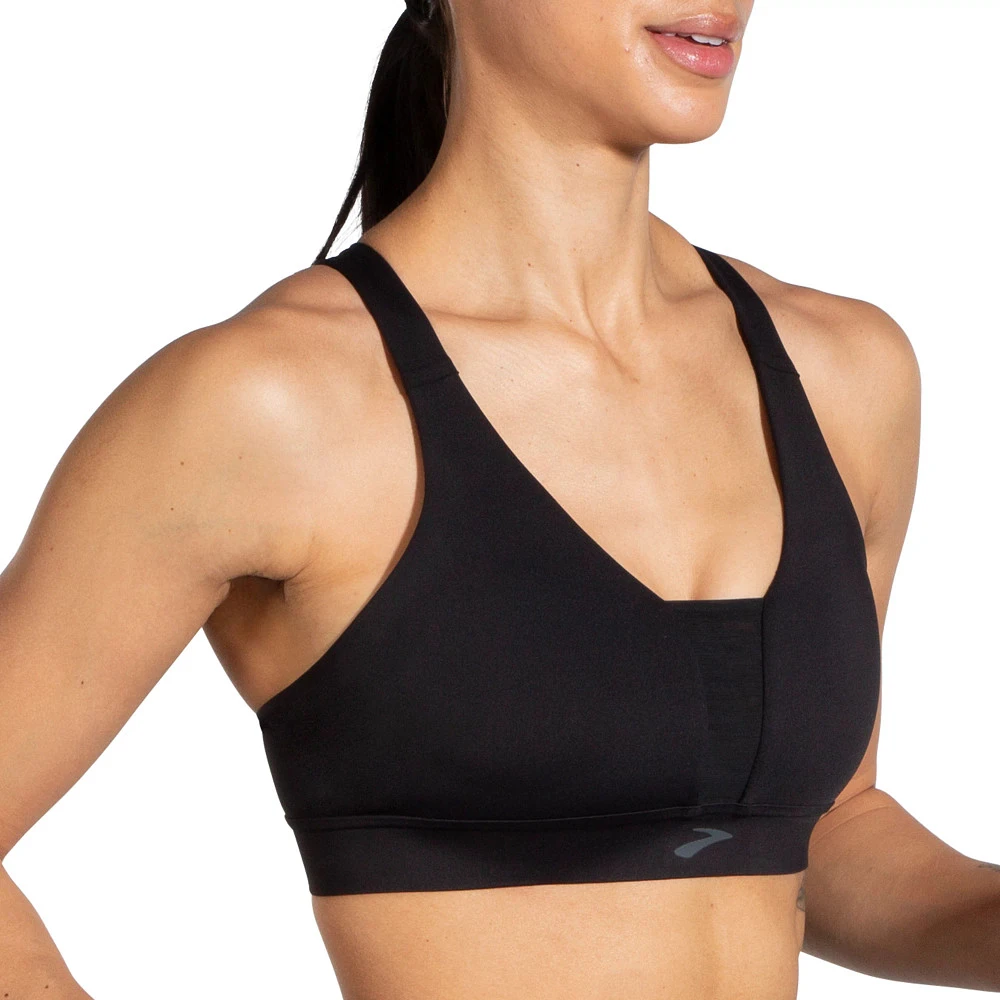 Women’s Brooks® Drive Plunge Run Bra :: Get the on-the-go support you need with the versatile Women’s Brooks Drive Plunge Run Bra. Designed with a flexible compression hold that moves with your body, this is fashion and function at its finest. Removeable cups offer added light coverage while modest styling keeps you moving in confidence while giving every run your all.