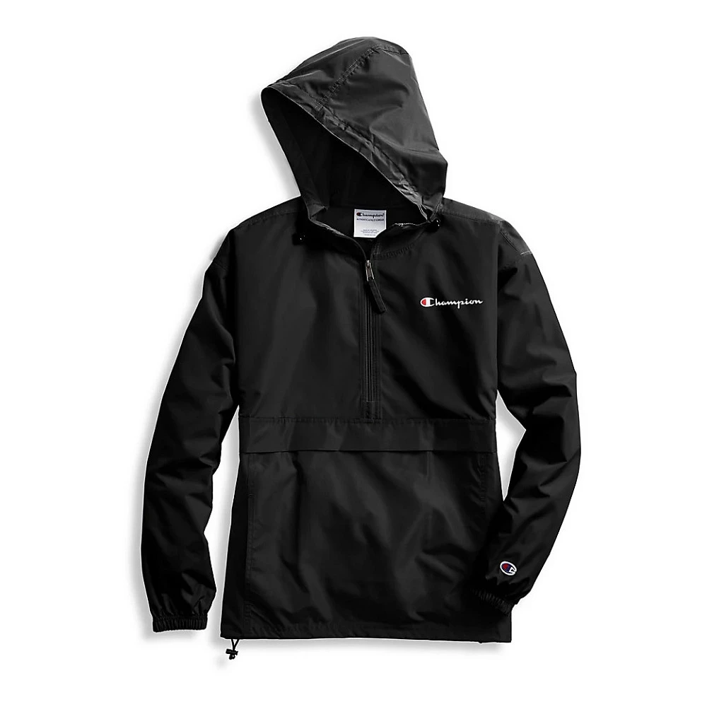 Women’s Champion® Packable Jacket :: Go from fair to stormy weather with a Jacket that packs into its own pocket. Water- and wind-resistant lightweight polyester micro poplin fabric keeps the elements out. Three-piece scuba hood with adjustable shock cords. Half zip front for easy on and off. Low-profile front kanga pocket. Straight bottom hem with shock cords and elastic cuffs to shield you from the elements. Jacket packs into a hidden front zip pocket for convenient, easy storage. Champion® logo screen-print left chest. C patch logo on cuff.