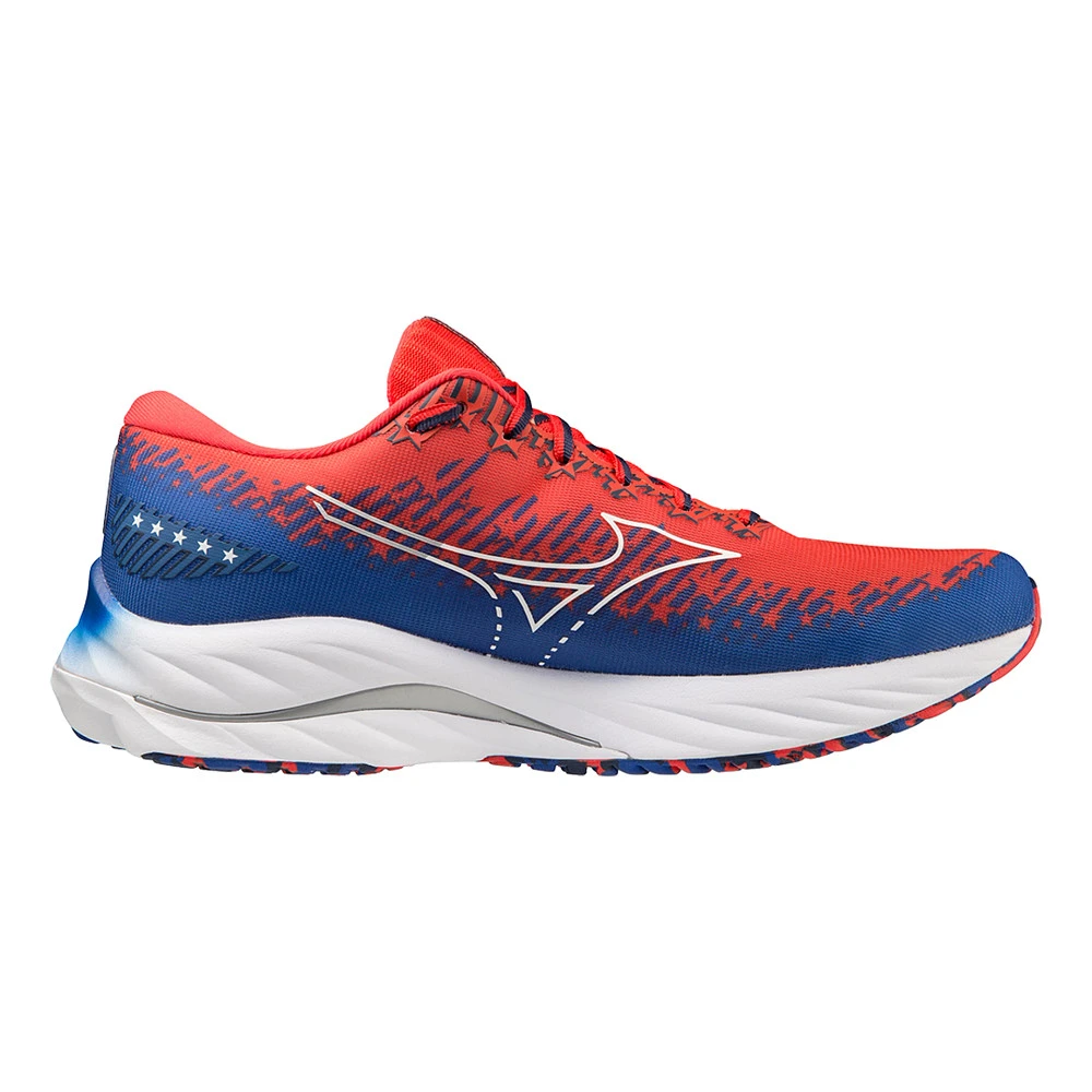 Women’S MIZUNO® WAVE RIDER USA :: Show your pride with the special edition Women’s Mizuno Wave Rider USA running shoes. This beauty boasts a gradient of red and blue from top to bottom and is finished off with a starry-like outsole that will turn heads. This 26th edition incorporates an unbelievably breathable jacquard mesh upper that feels as good as it looks. Your new MIZUNO ENERZY cushioning smooths out your run and improves your energy ratio to maximize the responsiveness you get out of every single stride. Find your ultimate running with Mizuno Wave® technology with your most cushy response ever.